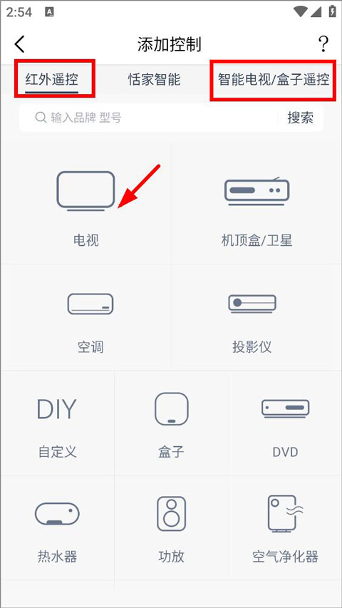 2、进入添加控制页面后,用户可以选择红外遥控或是智能电视/盒子的遥控方式;