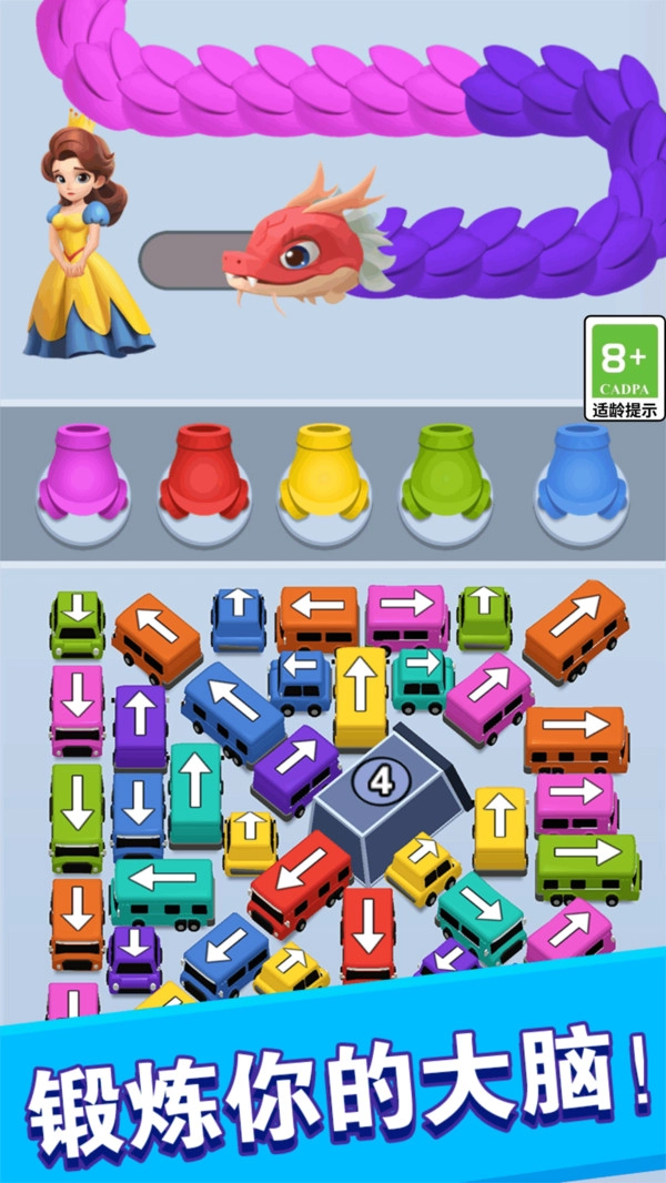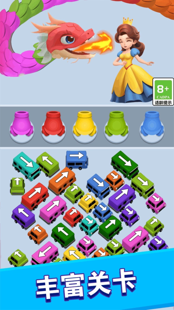 2. 箭头元素的设定:每一辆小车,除了在颜色上有所区分之外,还带有各不相同的方向标识。在进行消除操作时,需要同时对这两个条件进行判断,既充满烧脑的乐趣,又能带来超有感觉的过瘾体验。