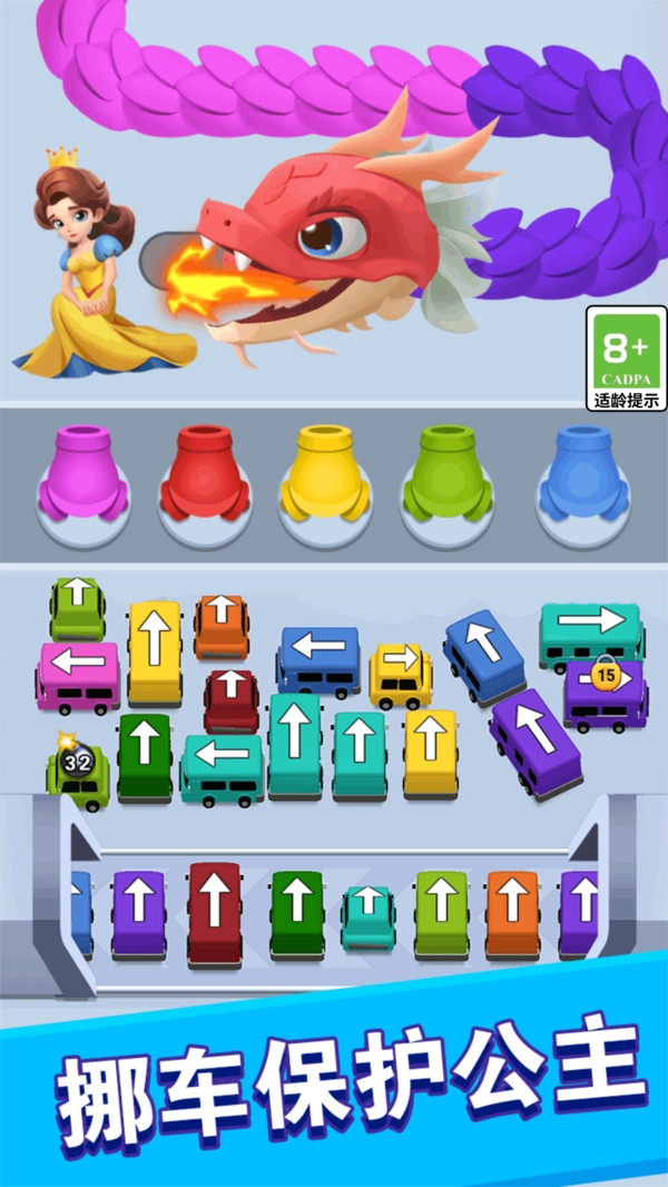 1. 基础操作指南:只需点击颜色相同且箭头指向一致的小车,就能实现消除。每一次消除,都能为公主清扫出一段安全的前行道路,过程紧张刺激。
