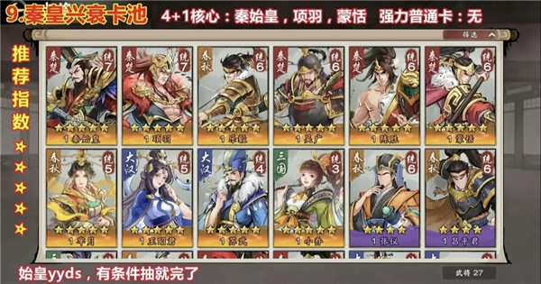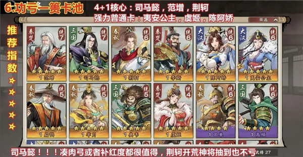 3、如果抽到了核心角色秦始皇,可以组建秦始皇、蒙恬和巴清的队伍。第一赛季赠送的福利非常丰富,因此完全不必担心无法积累足够的招募令和金布。只需要跟随盟友攻打城池,完成主线任务以及参与新服庆典活动,就能积攒大量的招募令和金布;接下来继续积累这些资源,等待“用兵如神”征程卡包的到来。一旦卡包开放,使用之前积累的招募令和金布进行抽取,直到获得蒙恬为止即可停止。需要注意的是,招募令和金布必须谨慎使用,要将宝贵的资源用于最需要的地方,即针对我们想要构建的队伍来进行有针对性的抽取。