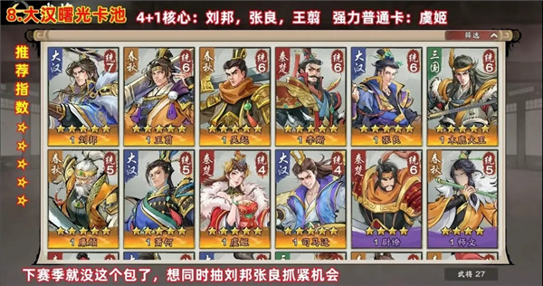 1第一天完成主线任务直到第五章,在新手卡池进行五连抽,目标是抽到赵姬。如果没有抽中,可以继续尝试,直到获得赵姬为止。赵姬的传承技能“凤歌鸾舞”在后续赛季中都会用到。