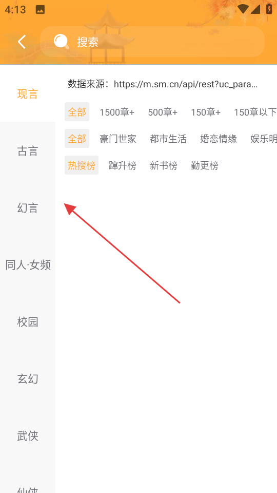 3、分类页面左侧有现言古言幻言等不同小说类别,你可以选择感兴趣的类别,选好类别后右侧还有按章节数,题材以及榜单的筛选选项,能更精准地找到符合自己阅读喜好的小说。