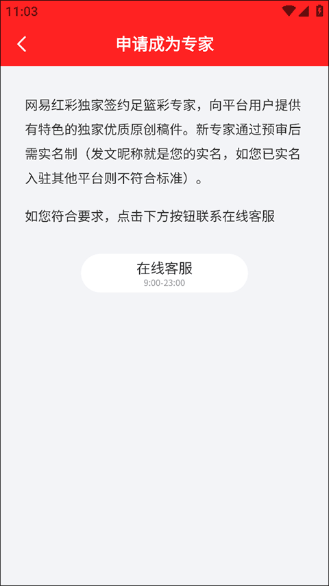 2、在申请成为专家界面找到并点击“在线客服”按钮选项;