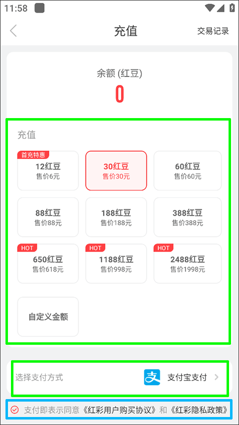 2、在充值页面上,选定充值金额和支付方式后,勾选“支付即表示同意红彩用户购买协议和红彩隐私政策”,接着点击“立即支付”。