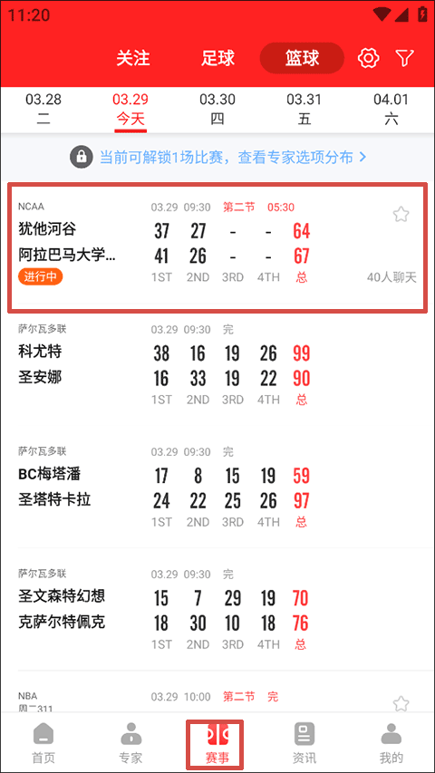 1、启动应用后,在赛事部分找到并点击红色框内的赛事选项,这样观看正在进行的比赛会更加直观。