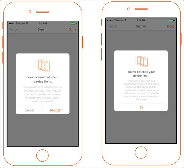 你可以同时在最多3台设备上订阅SoundCloud Go(此限制不包括通过桌面使用SoundCloud Go)。如果你尝试登录到第四个设备,系统会要求你确认你的选择。此时,最旧的登录会话将被自动注销,并且该设备上保存的所有用于离线收听的曲目或播放列表也会被删除。当你登录到第四台设备时,你会收到一个通知,告知你对“旧”设备做出的更改。此外,在30天内,你最多可以登录10台不同的设备。另外,请注意,同一时间只能用一台设备来收听你的Go/Go+订阅内容。如果你试图同时在多台设备上使用你的订阅,系统会显示一条消息:“已暂停,因为你已在另一台设备上开始播放。”