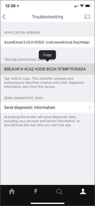 “故障排除标识符”是一个独一无二的编号,它能够协助SoundCloud的工程师团队通过审查SoundCloud应用生成的日志来研究与设备有关的各种问题。