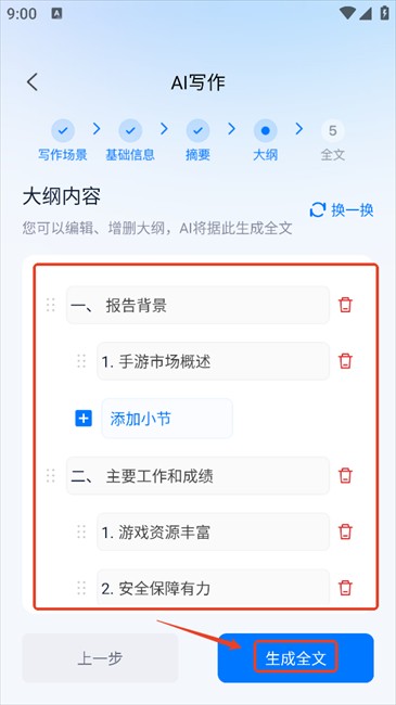 5.根据需要编辑大纲内容,完成编辑后点击“生成全文”
