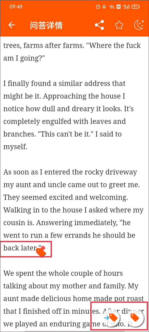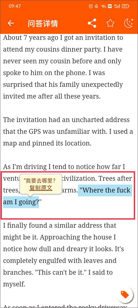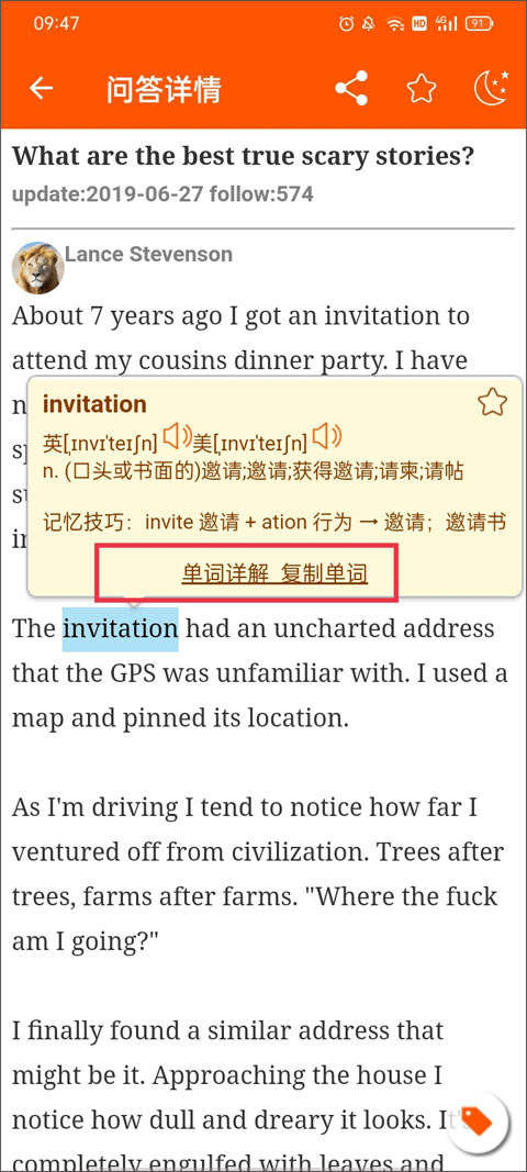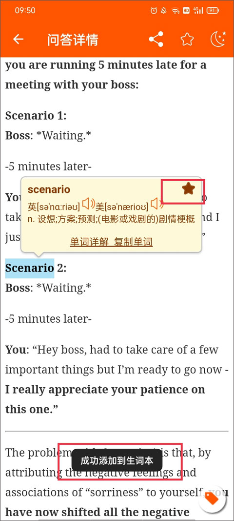 5、想要将单词添加加到生词本中,只需要在问答详情页面中点击你想要添加的单词,并点击右上方的星星进行收藏。