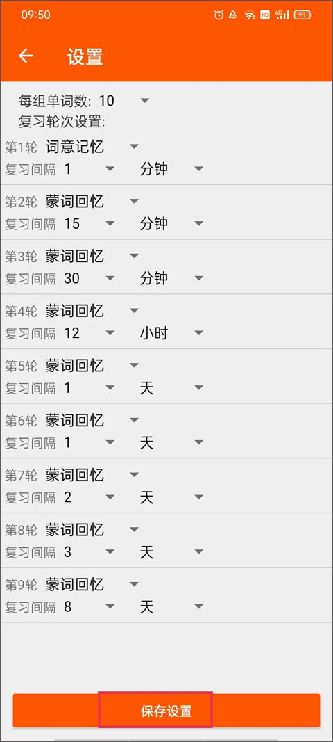 2、设置单词数、复习间隔,最后点击保存设置即可。
