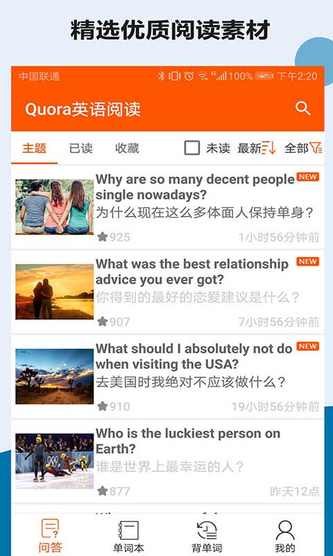 Quora英语阅读,为您精心挑选知识问答网站Quora上最受欢迎的问题及答案。它不仅有助于您学习英语,还能让您深入了解世界各地的文化和风俗。