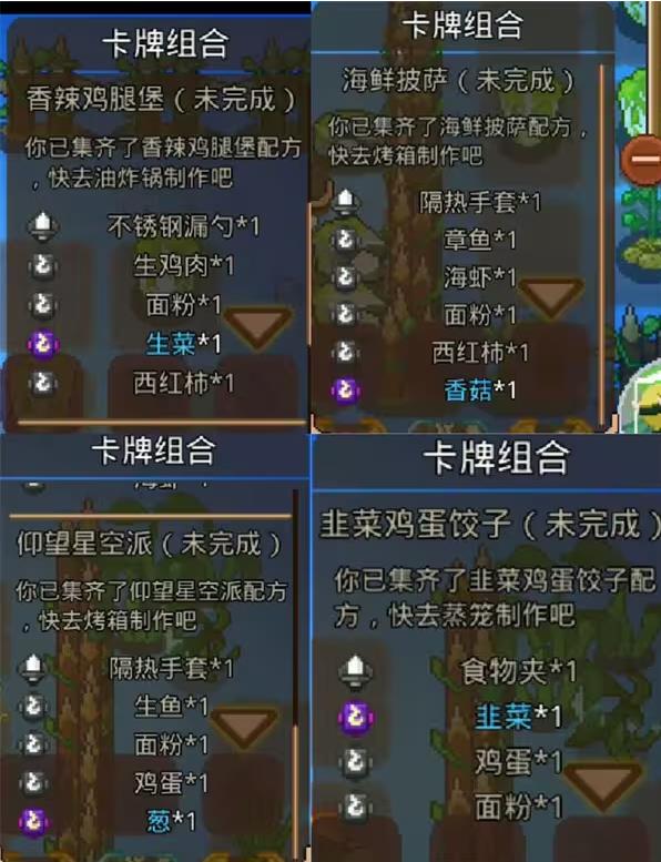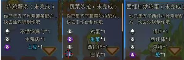 1、需要从采集食材开始制作菜肴,做菜需要携带正确的食材用正确的特殊武器(烹饪区左侧可装备到武器栏的物品 )攻击对应的厨具(烹饪区右侧不可移动、拾取,但可被攻击的物品)