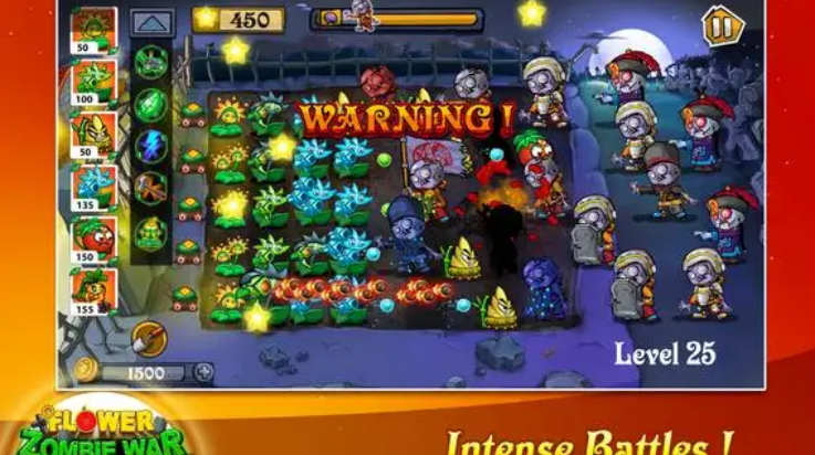 4、完成新的植物,不断升级自己的植物,提高你的战斗力并开始合理布局,抵御入侵的僵尸