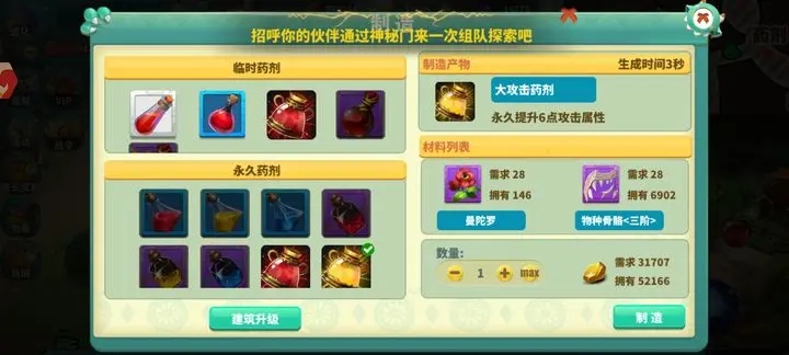6:制作药品,(家园右上角可制作药品,自己加各种属性的药剂,是除了装备以外,永久提升属性的东西,
