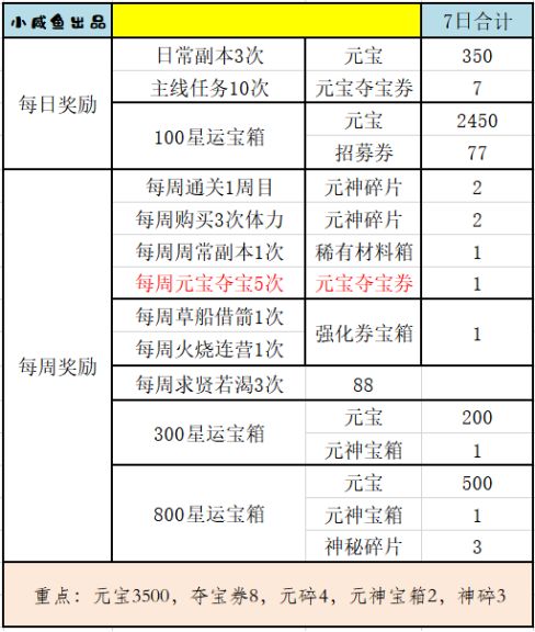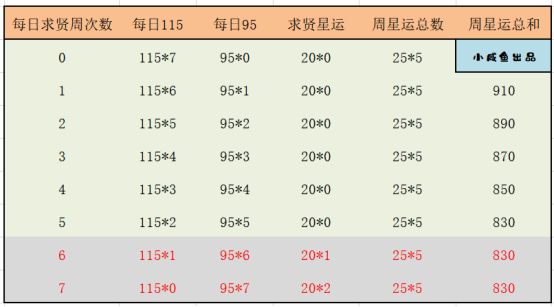 2、结合每日和每周的情况,我们可以算出每日获取星运的情况如下: