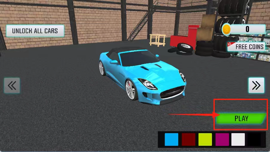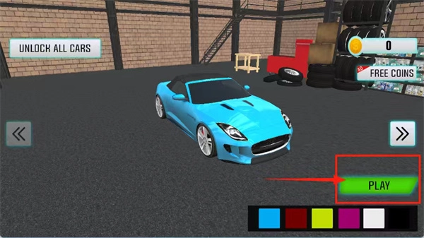 2、点击“PLAY”即可直接开启游戏。要是希望解锁所有车辆,就点击左上角的“UNLOCK ALL CARS”。要是金币不足,点击“FREE COINS”来获取更多金币。