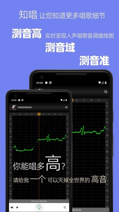 通过实时捕捉麦克风的音频信号,将人声的音高与对应的音名关联起来,并立即以音调曲线的形式在屏幕上显示。