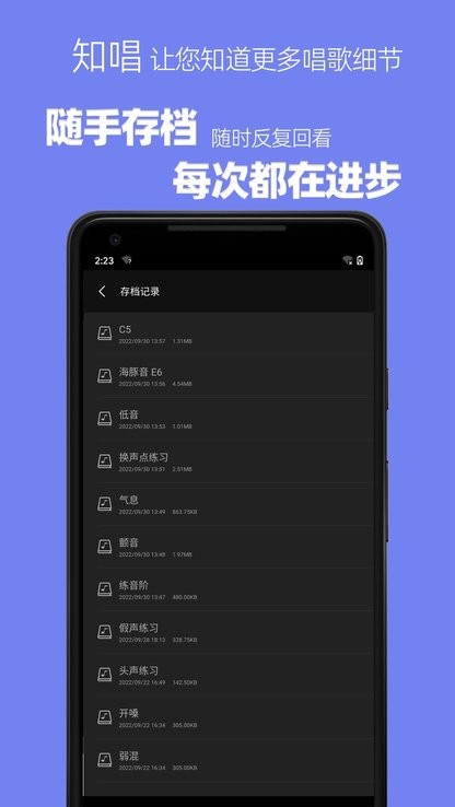 您还可以保存每一次的练声记录,做好备注,方便随时回看,不错过每一次的小进步,记录成长轨迹。