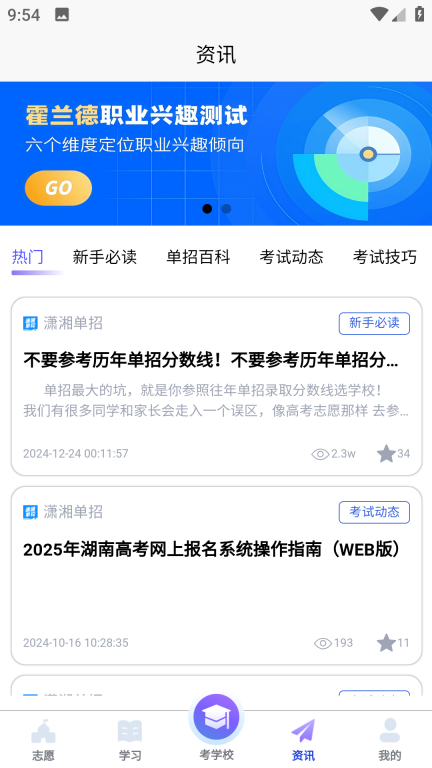 潇湘单招是一款集多种功能于一体的手机教学服务软件,用户不仅能够通过该软件查询报考信息,还能利用它进行学习。软件内设有报考查询功能,如果你不清楚自己适合报读哪所学校或哪个专业,可以通过这个平台做一个评估测试,帮助你找到更合适的专业方向。此外,软件还提供了丰富的学习资源,无论是基础知识还是高级内容一应俱全,非常实用!