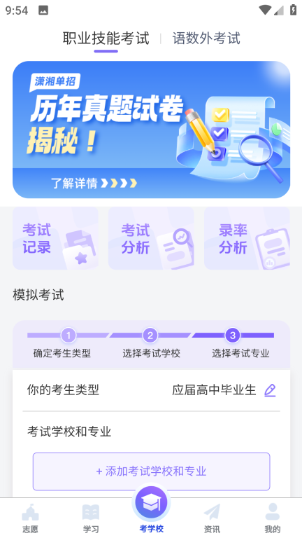 4、考学校版块,选择考试类型-选择学校专业-开始考试;