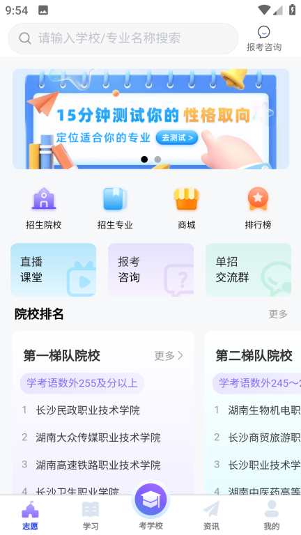 3、院校专业题库:涵盖湖南省内所有高职单招院校,整合了双高院校和国家级示范职业院校的信息。提供一站式服务,包括查询院校与选择专业,同时提供详细的院校介绍、招生简章、考试安排、院校对比以及排行榜等内容,帮助你快速找到理想的学校。