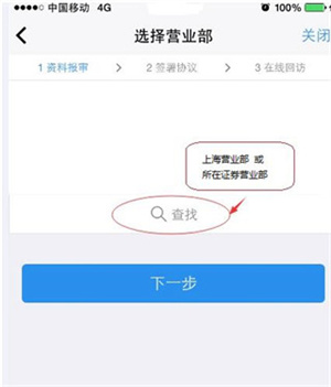 3、按照“查找-选择省份-选择城市-选择营业部”的步骤进行期货或证券营业部的选择(广发期货上海营业部)
