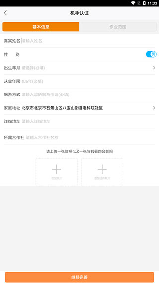 5、信息认证涵盖【基本信息】和【作业范围】两大部分,完成之后即可成功注册成为农机手。