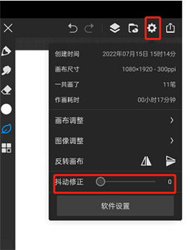2、点击右上角的【设置】,在弹出的界面下面就会有【抖动修正】工具,如图所示: