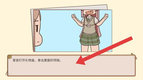 2、对话情节为爱音打开礼物盒,拿出里面的项链,呈现漫画分镜式的游戏场景,展示角色互动情节。