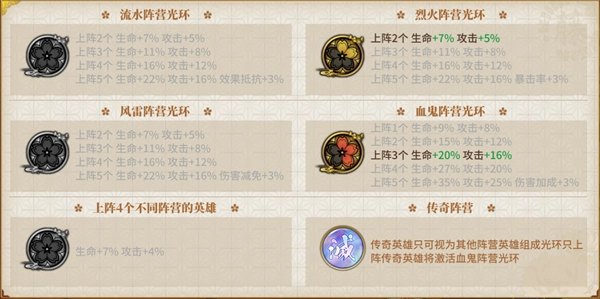 根据上阵的阵营英雄数量,战斗队伍能够获得对应的阵营光环加成,其中血鬼阵营属于稀有英雄阵营,能够获得更高的阵营光环加成。