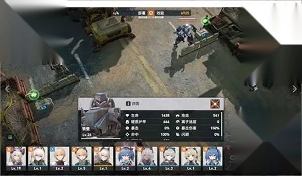 部署界面,六边形格子为我方的可部署格子,上方显示我方可部署的人形和当前效能(战力)我们可以通过拖动人形来调整阵容和布局,人形头顶的颜色标记代表当前人形的伤害类型。