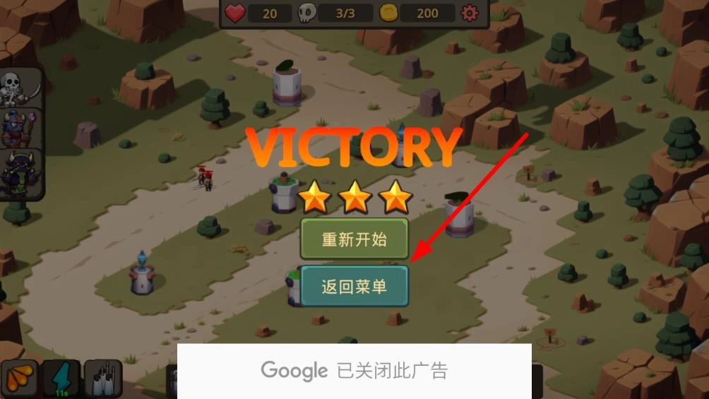 3、当成功完成防守后,界面上会醒目地显示 “VICTORY”。此时,只需点击 “返回菜单” 按钮,玩家就能获取相应的关卡奖励,从而为进入下一关或是升级防御塔做好充分准备。