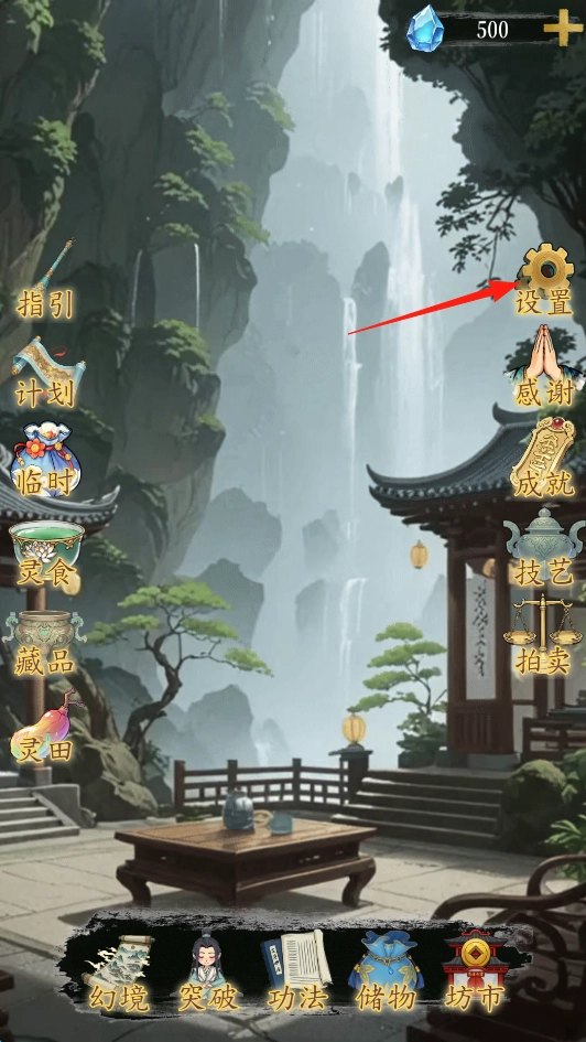 第一步:用初始500灵石从坊市中购买2个功法(属性加成)和1个术法(主动技能)。