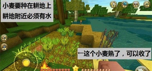 4、怎么种小麦?先做一把木锄(石锄也可),找到一片靠近水源的草地,右手拿着锄头点草地,即可变成耕地(耕地没有水会干旱)