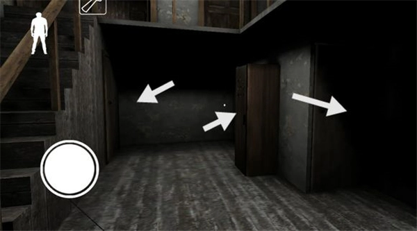 下了楼梯后,左边地板上有一根黑线,从黑线上面走过铃铛就会响,这点需要留意。楼梯旁边的柜子里能躲,柜子对面有一扇门,门里面可能会刷出东西。柜子旁边还有一扇门,它通向地下室(因为画面比较暗)