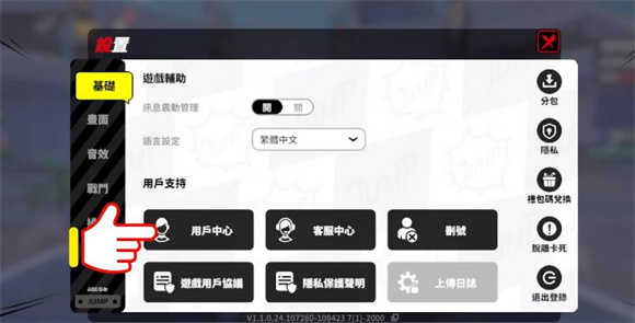 5、完成新手教程后点击界面左下角的齿轮,在基础点击用户中心,然后通过绑定邮箱来注册Dena账号。