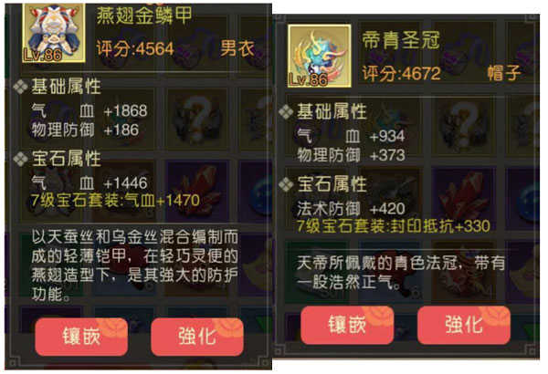 衣服和帽子:衣服跟帽子增加的都是气血以及物防。实际上,防具的这两类属性是有主副之分的,衣服的主要属性是气血,帽子的主要属性则是物防。