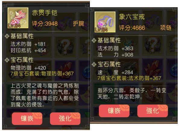 宝石最高镶嵌等级与角色等级有关,根据玩家职业的不同,选择最优的镶嵌方案。注意:宝石拥有套装属性,当可镶嵌宝石均为同一等级时,则可获得该套装属性加成
