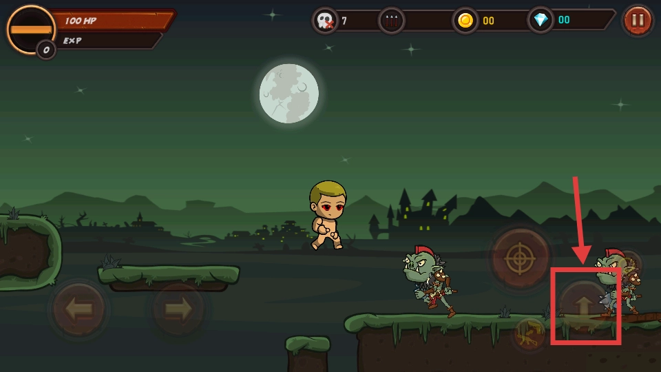 3、通过点击右侧的跳跃键来越过地形上的障碍,当靠近敌人之后,就能发起攻击,从而推动关卡的进展。