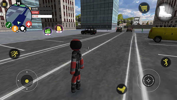 在游戏中,左侧操作可实现移动与加速,右侧对应绳索、攻击(含跳跃操作)以及单纯的跳跃功能。右上侧设有武器更换区域,同时血量与经验的显示会实时更新,信息清晰明了。玩家能凭借自由多样的玩法,与其他帮派人物展开交火。在交火过程中,成功击杀对方可获取经验,连续击杀累积到一定程度便会产生星级。一旦星级出现,警察以及周边其他角色就会对你格外“关照”,向你发起猛烈进攻。此时,如何在重重攻势下存活,又怎样将其他人物成功击杀,就成了你亟待完成的任务。