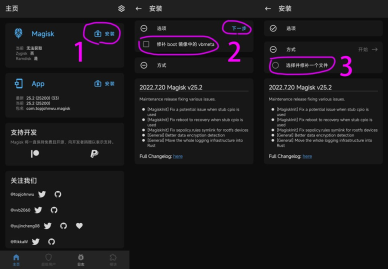 从Magisk v22.0版本起,Magisk与Magisk Manager已整合为单一文件:命名为Magisk.apk时,它作为Magisk应用程序,负责管理Magisk模块及相关功能;命名为Magisk.zip时,它是可刷入Magisk的卡刷包;而命名为uninstall.zip时,它则是用于卸载Magisk的卡刷包。