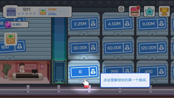 进入游戏后,持续点击屏幕,查看朋友临行前交给你的谈话内容。待对白结束,你将正式开启酒店大亨养成之旅。依照提示,先解锁第一个房间。