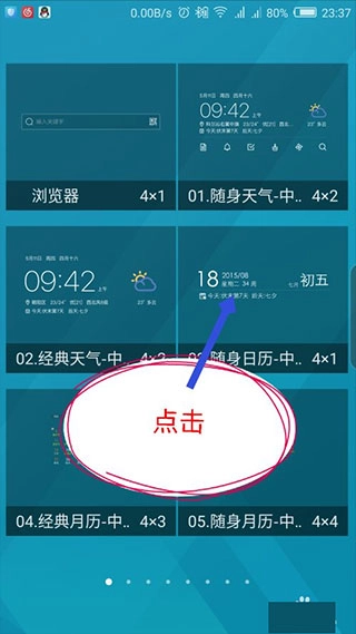 然后在打开的手机小部件里面,找到要添加的万年历插件,根据提示,拖拽插件或者点击插件;