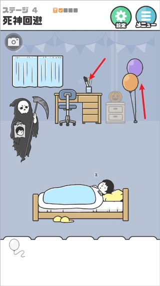 先从桌上拿起马克笔,再拿起旁边的气球,把马克笔和气球组合一下,就能得到一个画着人脸的气球。接着,把这个气球放在人的身体上,如此一来,死神就会错把气球当作本人而将其带走,这样便能顺利通过关卡了。