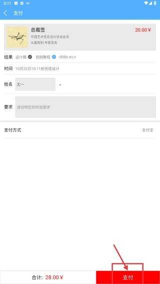 3、在支付页面,填写姓名、设计要求等信息后,点击支付按钮,完成支付操作。