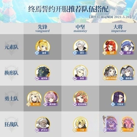 特殊推荐几组实用的初期搭配组合。由于资源获取的差异,我们将更多的关注集中于SR和R角色组合。