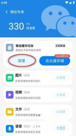 如果是“微信清理”,则专门针对微信缓存进行清理,随意选择不需要的文件进行删除。