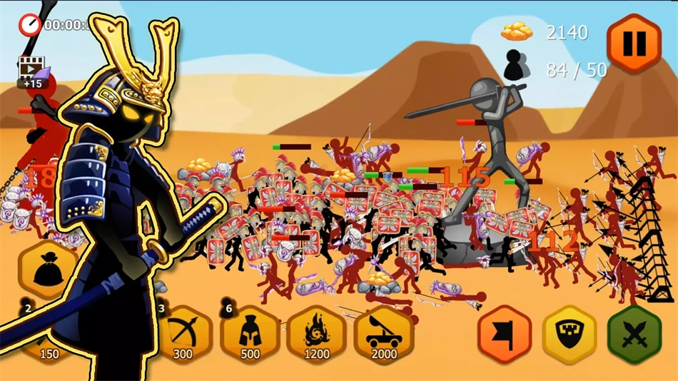 2、这款游戏的玩法十分简单,玩家要合理安排阵容,在战争里打败敌方火柴人。界面左侧能够挑选可购买的兵种,右侧依次是集合、防御和攻击选项。游戏左上方会展示当前关卡已用时间,右上方则呈现金币数量以及兵种数量。