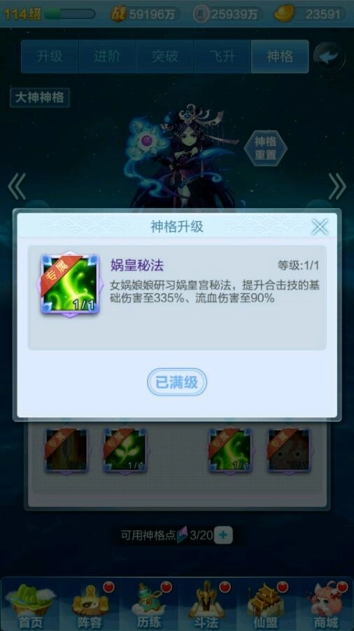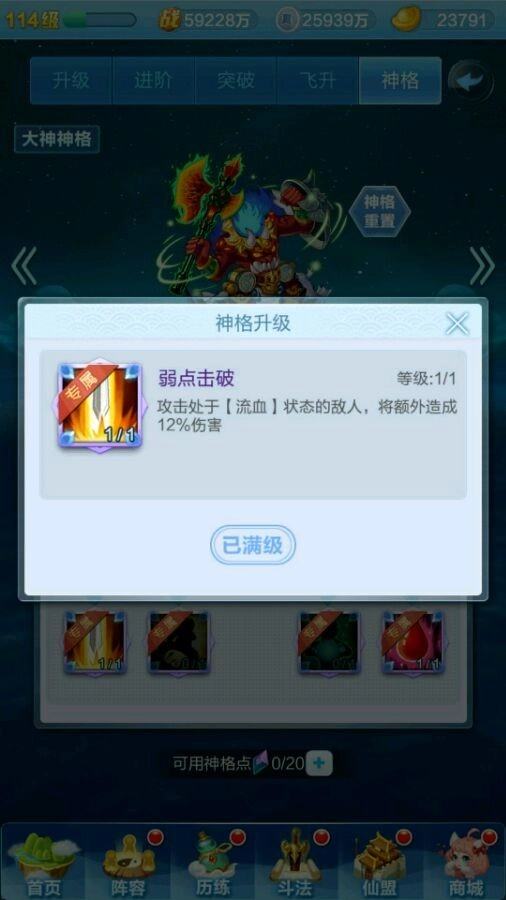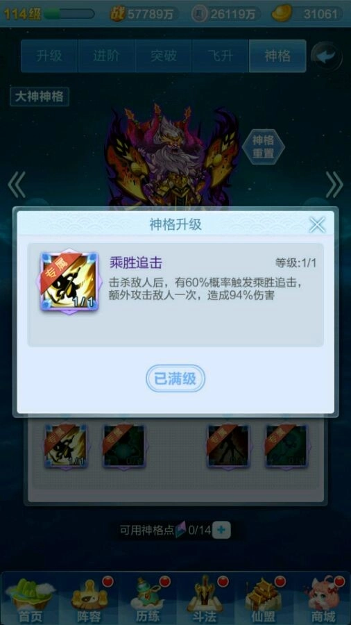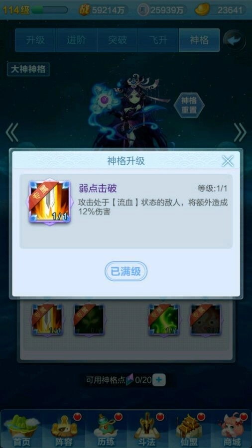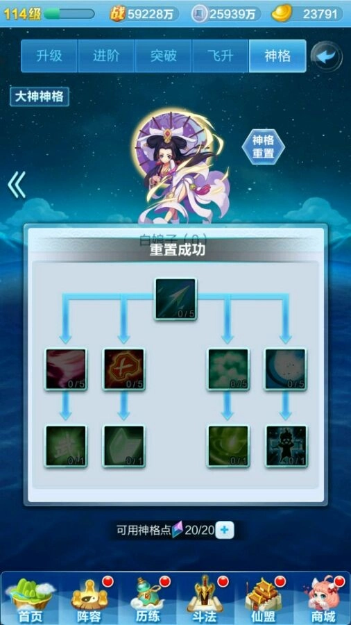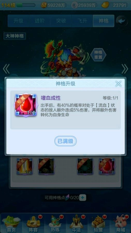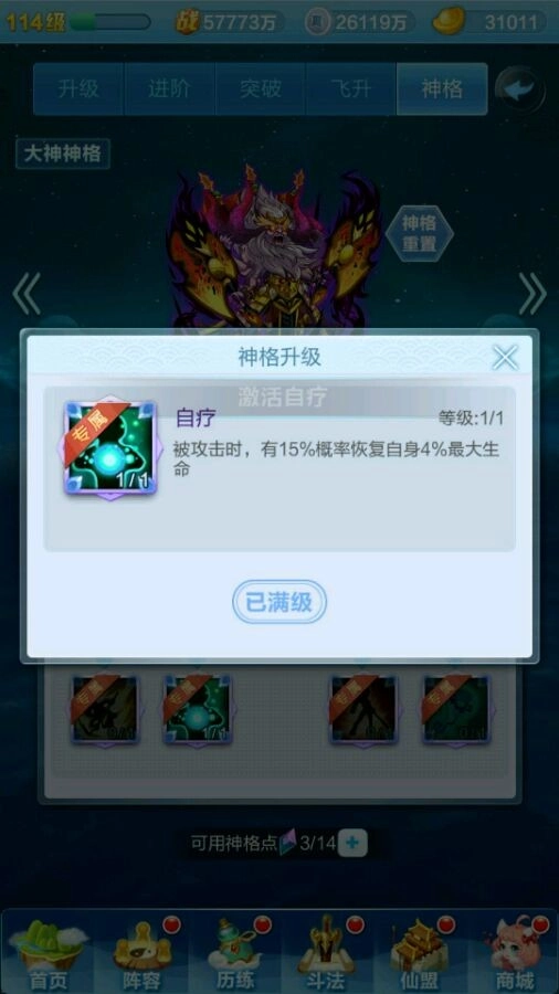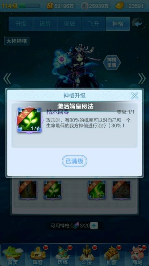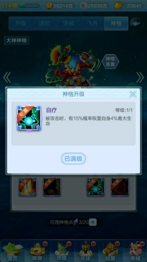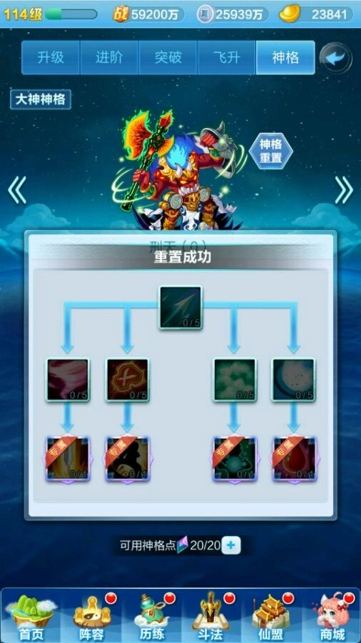 先来给大家说一下神格系统的基础构成:每个神仙都有自己的一套神格,都是有九个技能可以选择,有点类似天赋树,红色神仙有4个专属天赋,而橙色神仙的神格天赋都一样。每个神仙最多有20个天赋点用来点天赋,通过飞升获得天赋点(如下图)
