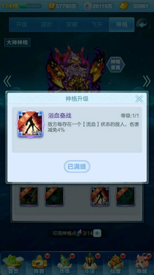 浴血奋战:敌方每存在一个流血状态的敌人,获得伤害减免4%,也就是刑天出手之后,蚩尤可以获得最大24%的减伤,感觉好肉啊o>_
